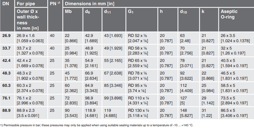 Размеры в мм [в] Соединение асептической резьбовой трубы DIN 11864-1